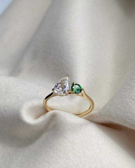 2.4Ct Green Round And White Pear Cut Two Stone Ring | Special Occasion Ring | Birthday Gift Ring For Her | Dainty Ring