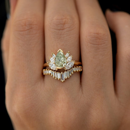 2.6Ct Green Pear Cut Solitaire Ring Set | Engagement Ring Set | Luxury Jewelry | Beautiful Ring Set