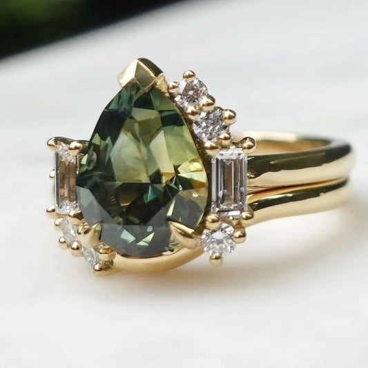 3.20Ct Green Blue Pear Cut Moissanite Solitaire Ring Set | Wedding Ring Set For Bridal | Designer Ring Set | Timeless Design