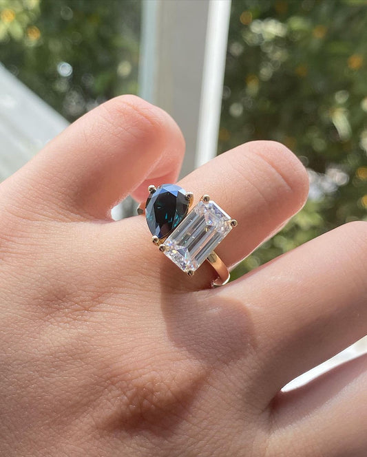 3.20Ct White Pear And Blue Radiant Cut Two Stone Ring | Toi Et Moi Ring | Engagement Ring