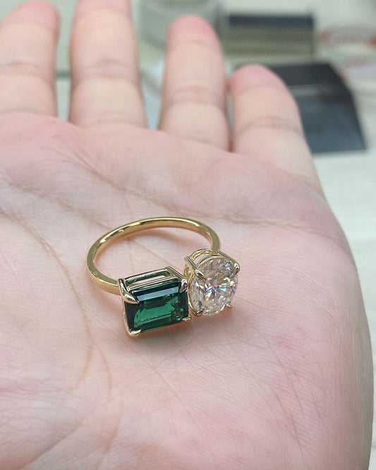 3.20Ct White Oval And Green Emerald Cut Two Stone Ring | Engagement Ring For Women | Toi Et Moi Ring