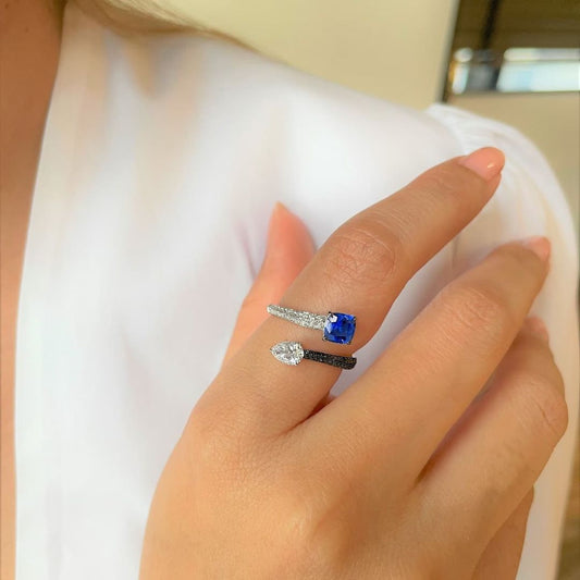 2.2CT Blue Cushion White Pear Cut Two Stone Ring | Birthday Gift Ring | Bypass Ring | Women Jewelry
