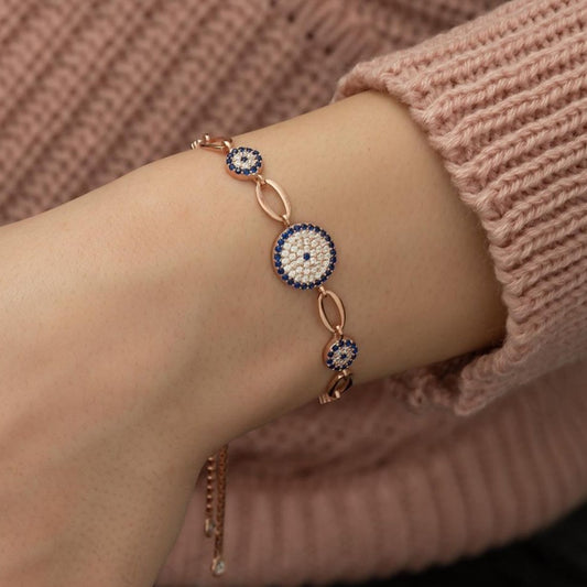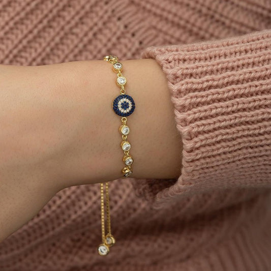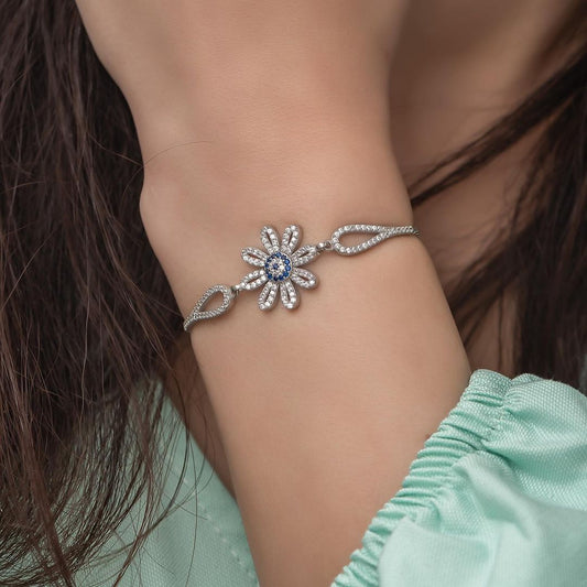 Eye Flower Blue And White Round Brilliant Cut Signity Diamond Cluster And Pave Bracelet | Adjustable Bracelet For Her | Anniversary Gift Bracelet For Wife