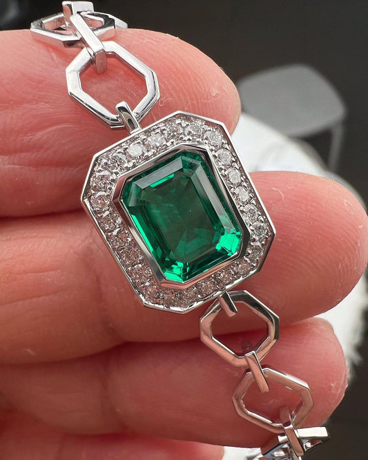 Green Emerald Brilliant Cut Signity Diamond Bezel With Halo Bracelet For Women | Party Wear Bracelet | Birthstone Gift Bracelet