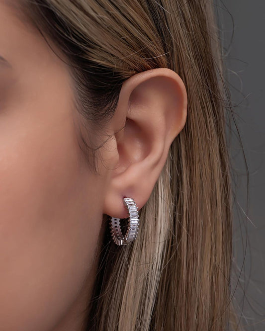 White Baguette Cut Cubic Zirconia Full Eternity And Prong Set Hoop Earring For Her | Birthday Gift Hoop Earring For Her | Everyday Wear Jewelry For Women