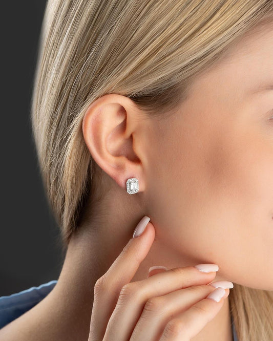 White Baguette Cut Cubic Zirconia Halo Setting Stud Earring For Her | Engagement Promise Stud Earring For Fiancee | Designer Earring For Women