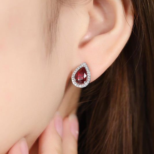 Red Pear Cut Cubic Zirconia Halo Earrings For Her | Anniversary Gift Earring For Wife | Women's Jewelry Collection