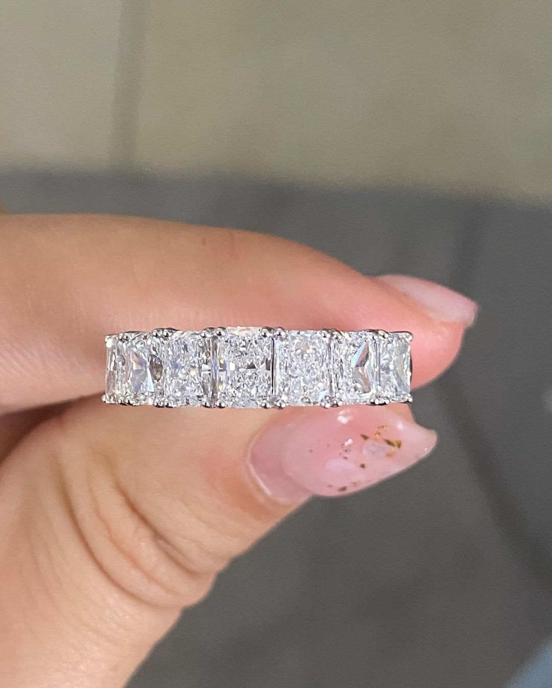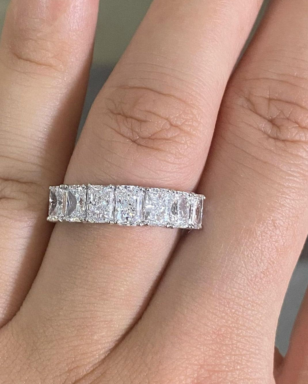 This 2.4Ct white radiant cut half eternity ring is perfect for a proposal or as a thank you gift. Its prong set design offers a classic yet modern look.