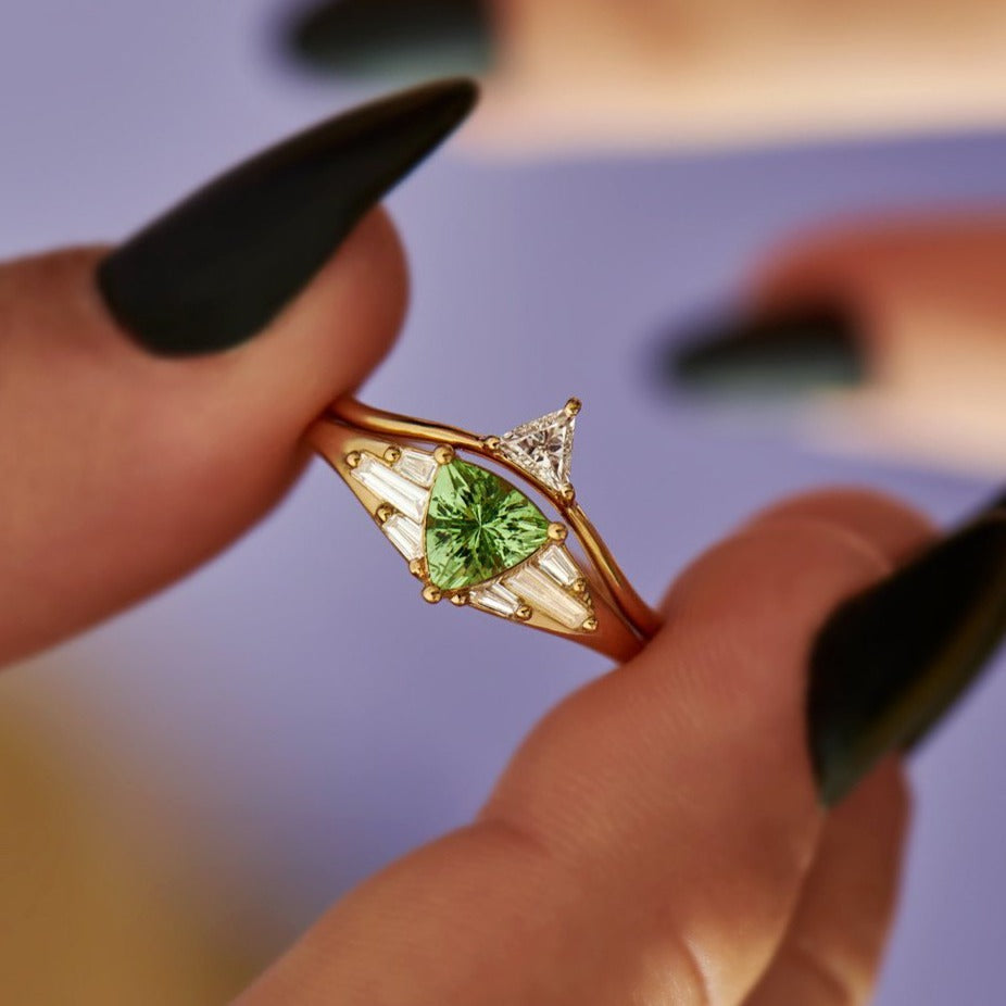 Designed to elevate any bridal ensemble, this ring set boasts an elegant design that is both timeless and chic. Its vibrant green hue adds a pop of color to any look, making it a perfect choice for the modern bride.
