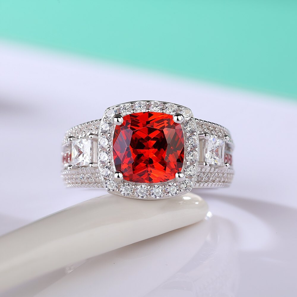 This stunning 3.20Ct Red Cushion Cut Halo Ring is a perfect choice for a wedding ring or bridal jewelry. The centerpiece features a vibrant red cushion cut cubic zirconia, surrounded by a sparkling halo of smaller cubic zirconia stones.