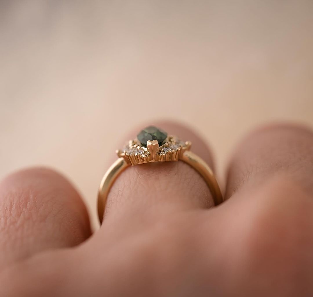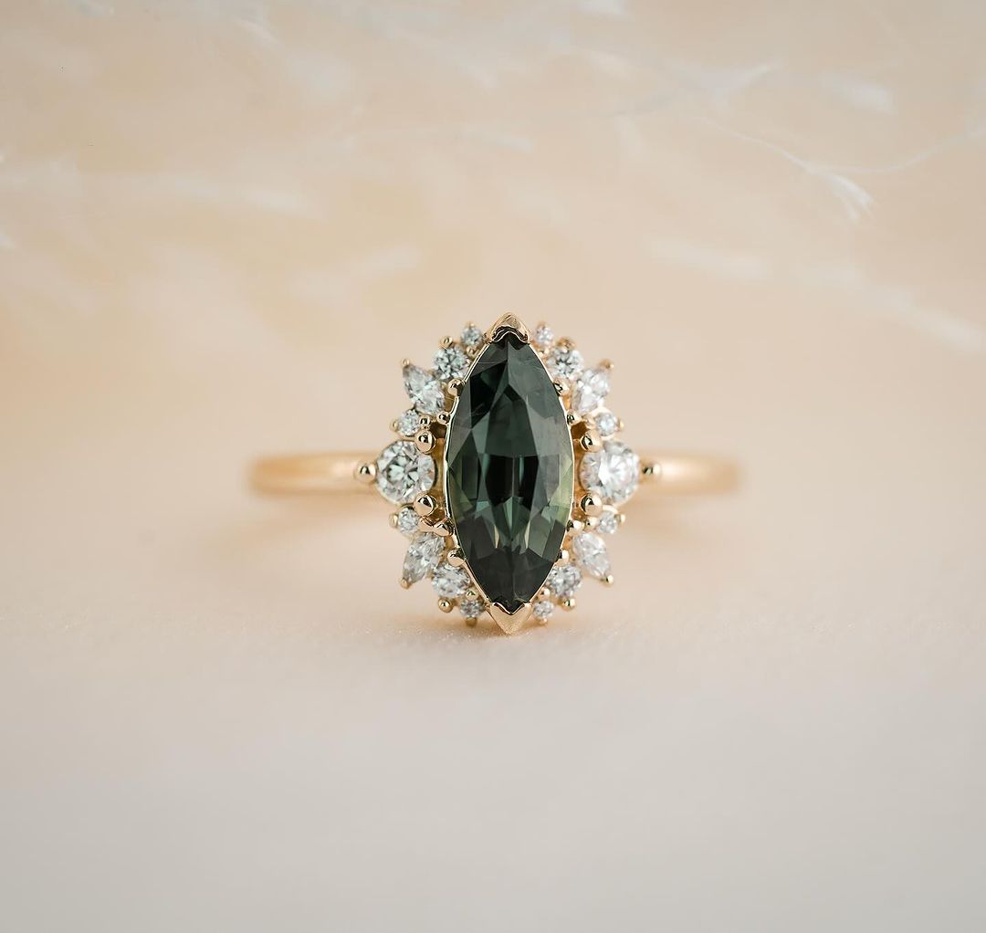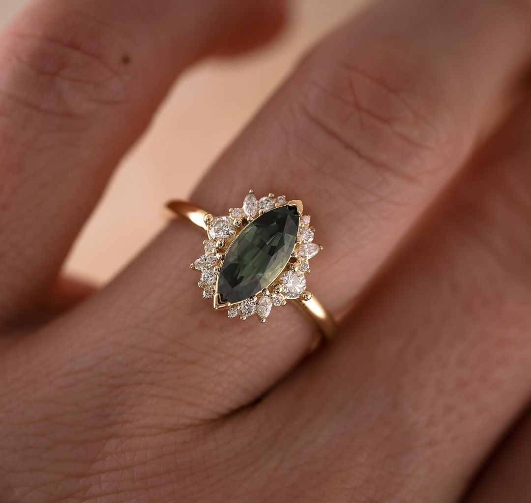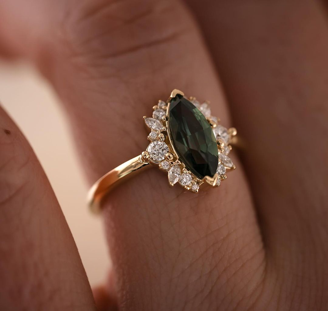 With its captivating marquise cut design and vibrant green hue, this ring is the perfect symbol of eternal love and commitment. Whether it's for the wedding day or everyday wear, this ring adds a touch of glamour to any bridal look.