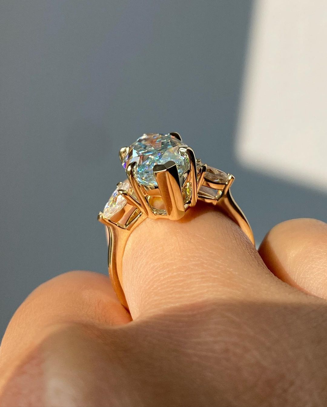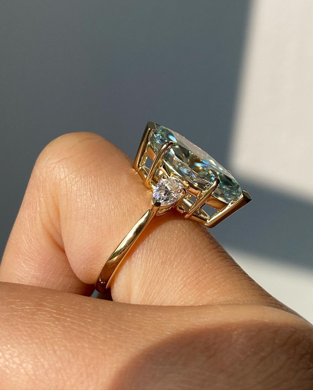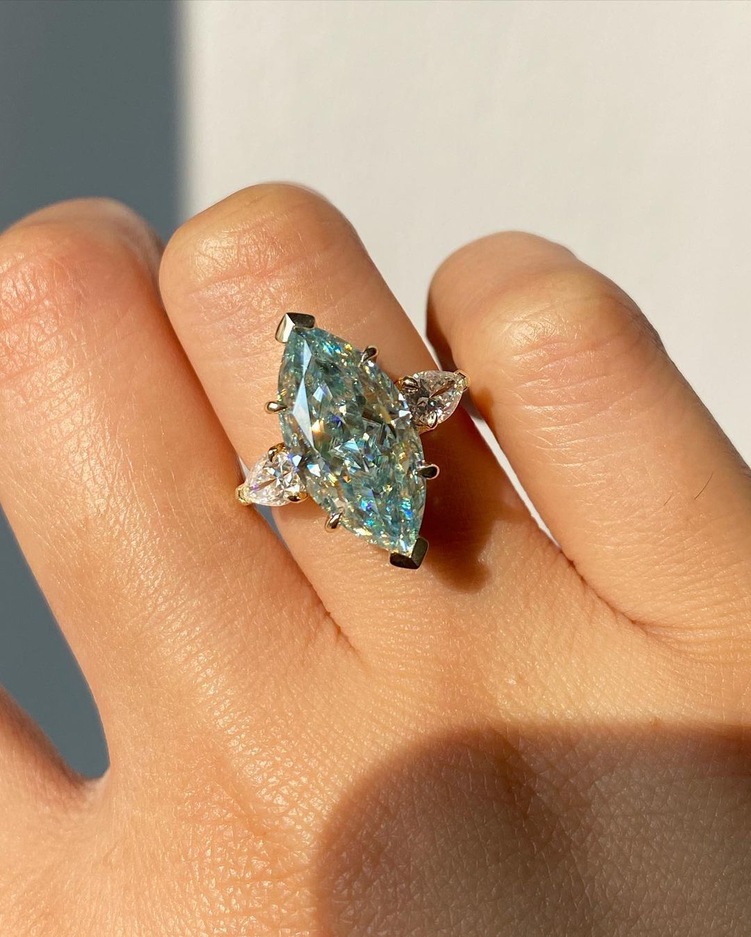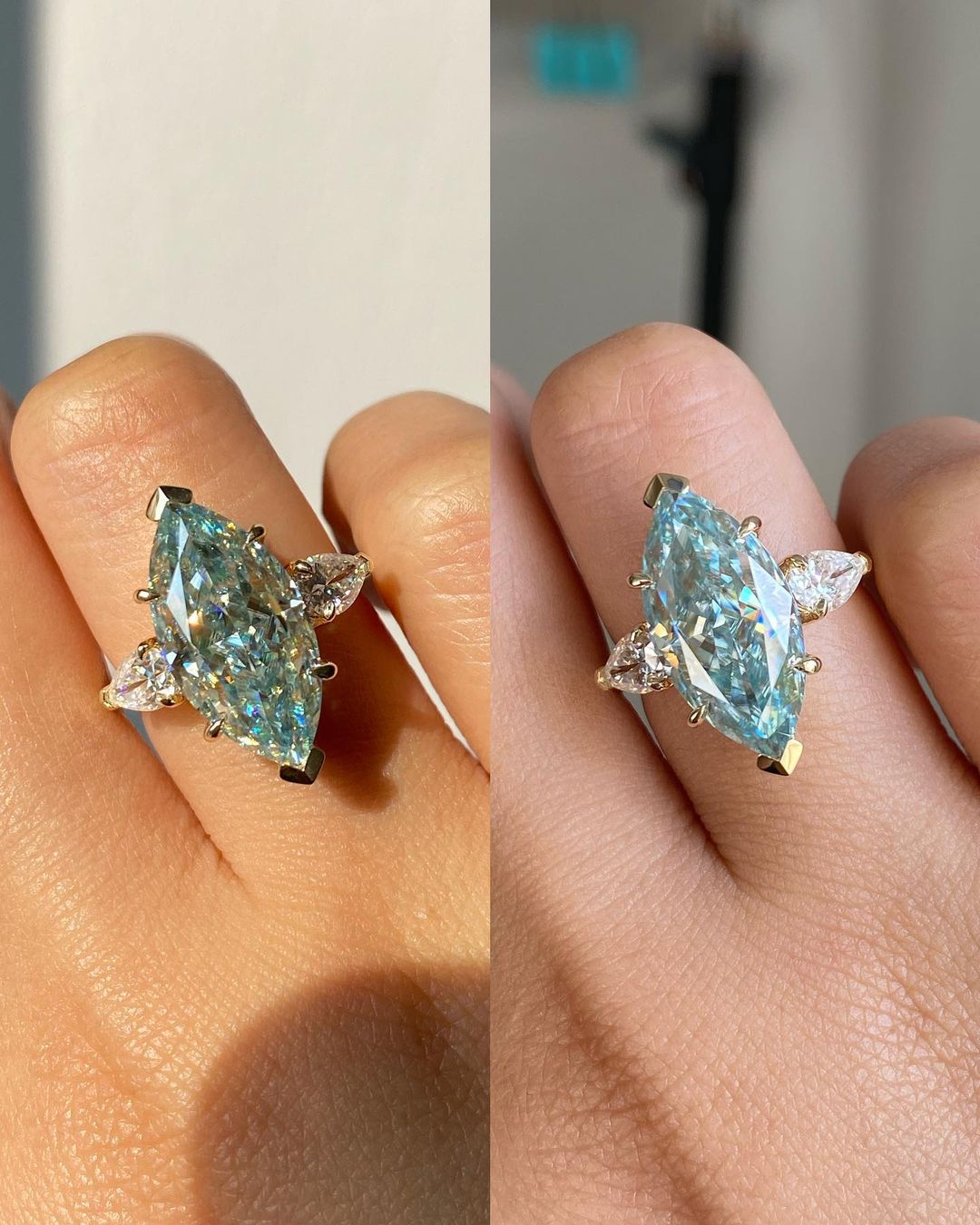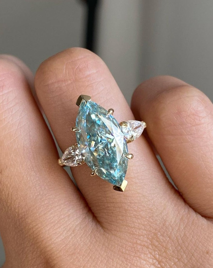 Introducing our 3.30Ct Green Blue Marquise Cut Moissanite Solitaire Ring, perfect for party wear. This stunning fashion jewelry piece features a vibrant green-blue marquise-cut moissanite as the main stone, complemented by pear-shaped cubic zirconia accents.